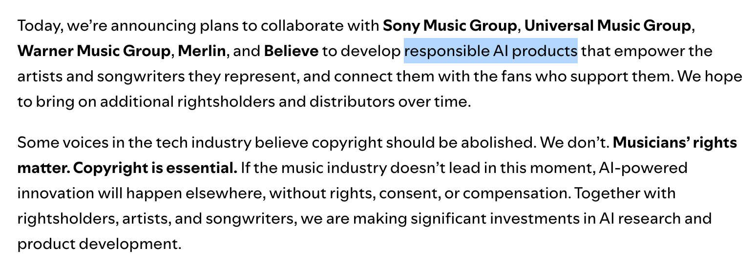 1.) Spotify is partnering with Sony Music Group, Universal Music Group, Warner Music Group, Merlin, and Believe.